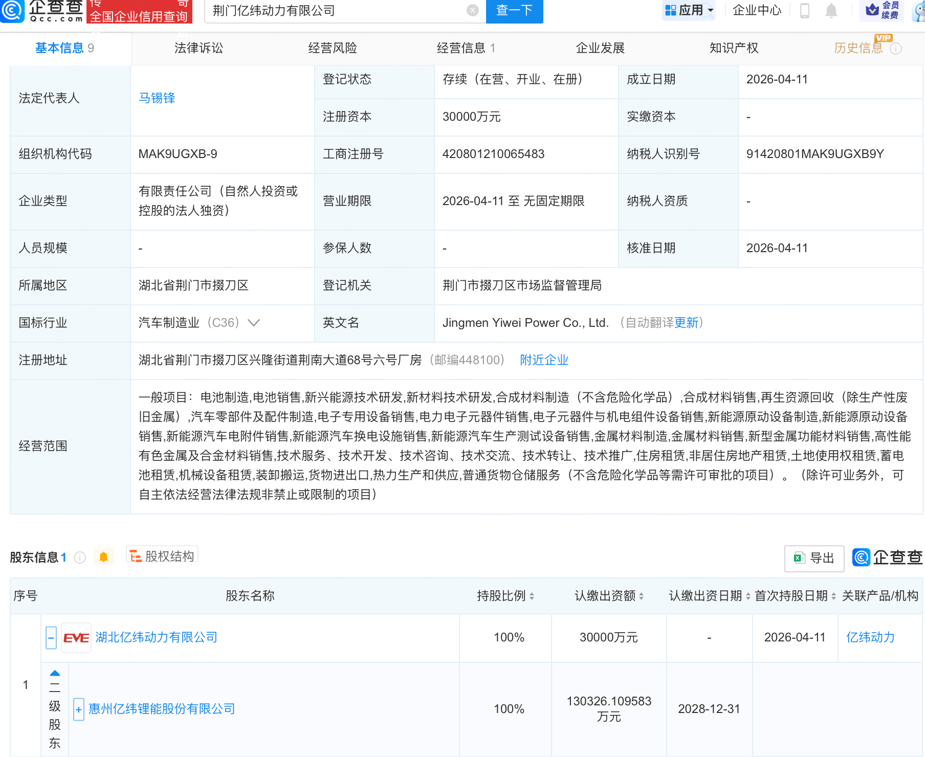 近日,荆门亿纬动力有限公司成立,注册资本3亿元,经营范围包含:金属材料制造;金属材料销售;新型金属功能材料销售;高性能有色金属及合金材料销售等。企查查股权穿透显示,该公司由亿纬锂能(300014)间接全资持股。